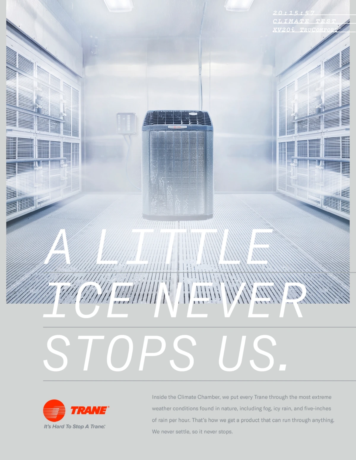 For Trane’s latest all-weather photographic campaign, we worked alongside director and photographer Benedict Redgrove to showcase Trane’s unstoppable machines as they endured the harshest of conditions. Placing the technology in extreme testing situations, our creative retouching team battled these elements to underscore and highlight the beauty within the durable design.